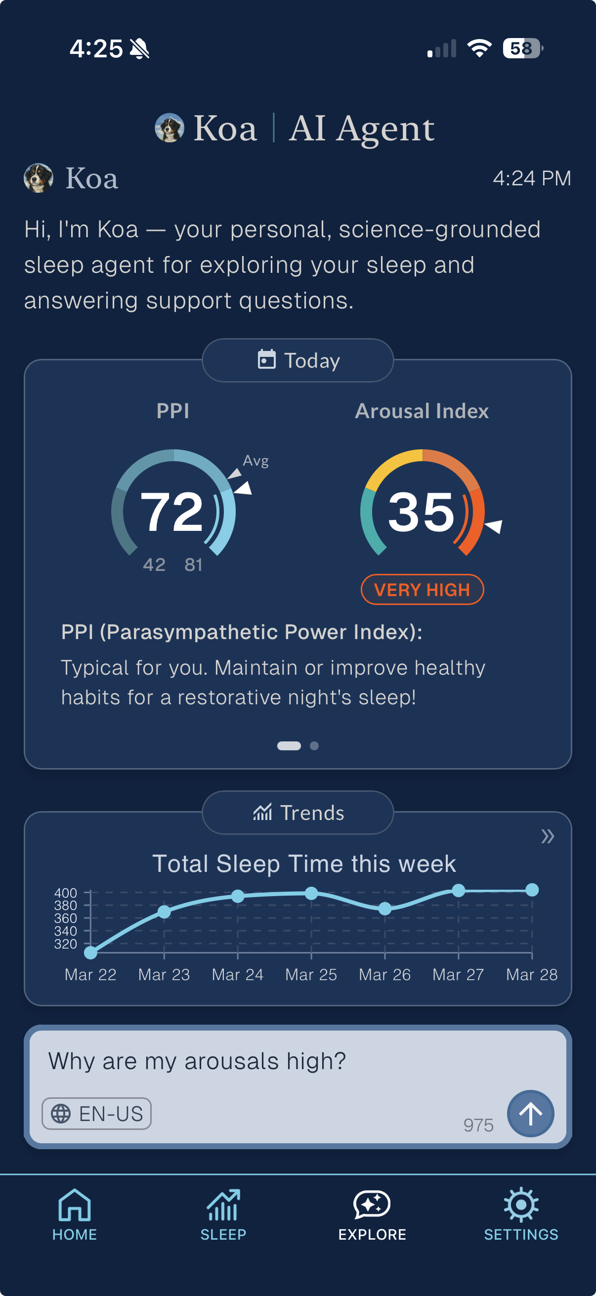 On-Demand Q&A: Wondering "Why are my arousals high?" Just ask. Koa functions as a conversational chat agent, providing instant, easy-to-understand explanations and support questions based on current sleep science.