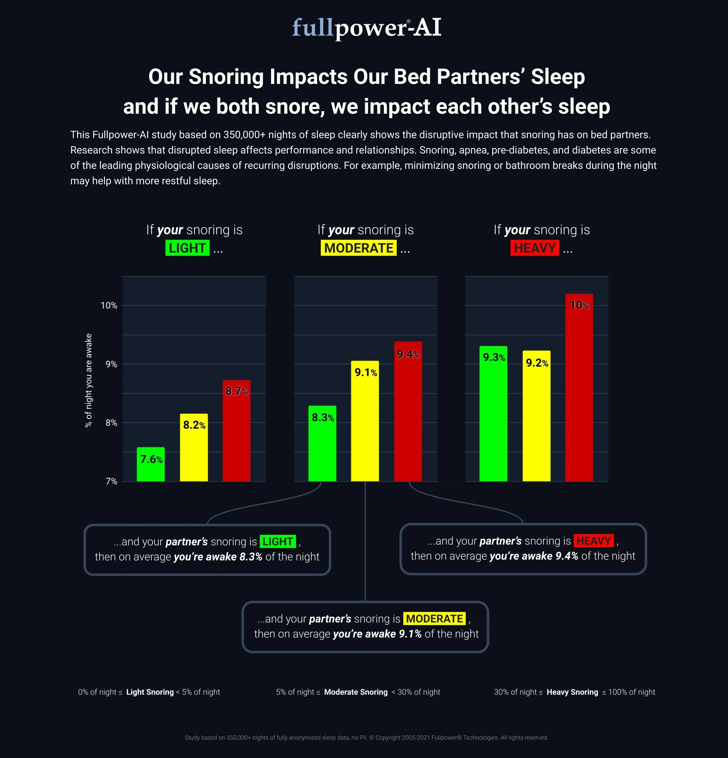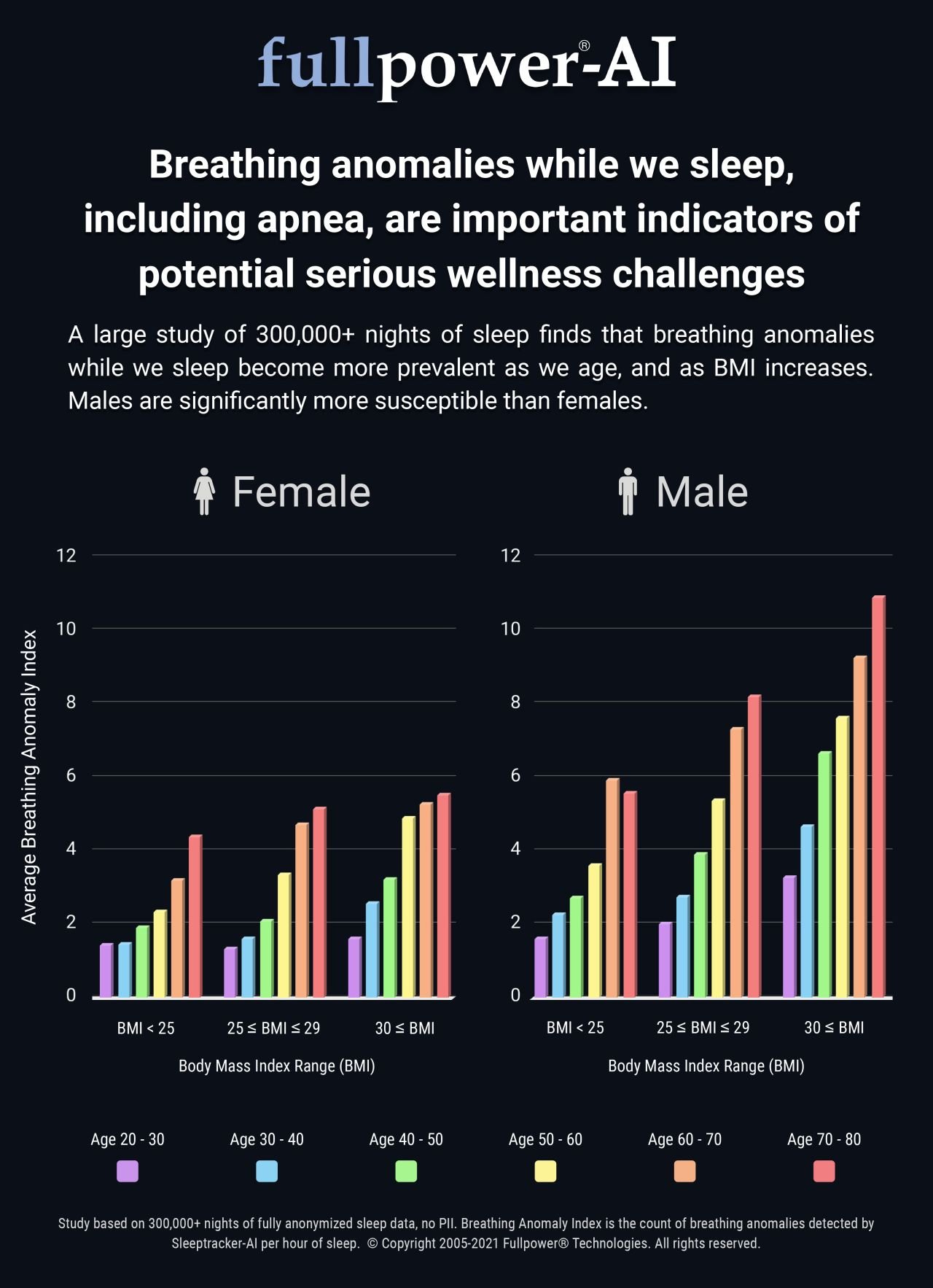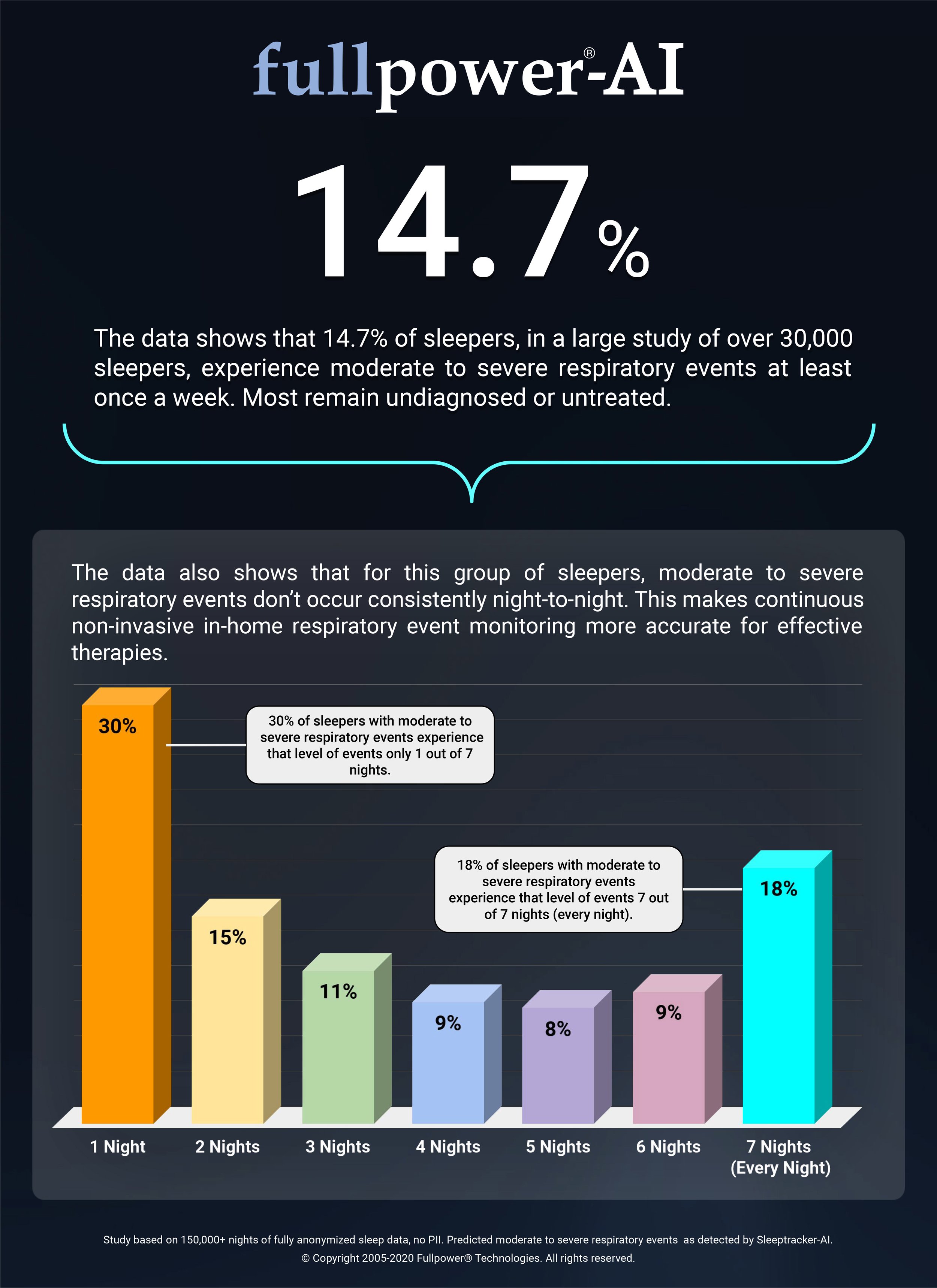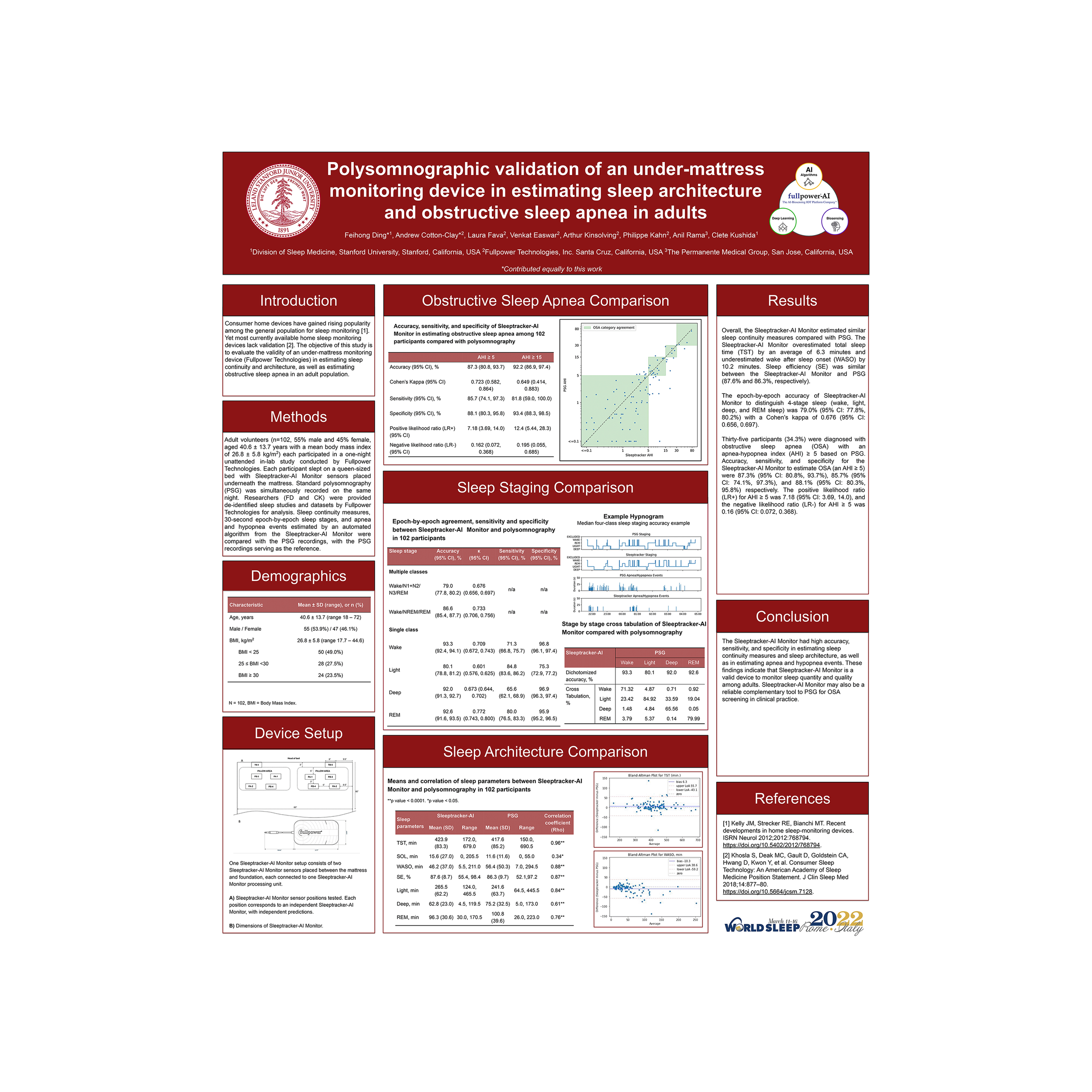 The Fullpower® Sleep by Sleeptracker-AI® Monitor has demonstrated high agreement with polysomnography in estimating sleep stages, according to published research. It also shows promise in identifying patterns consistent with disrupted breathing during sleep. While not a diagnostic tool, it offers a high level of accuracy for consumer wellness monitoring.